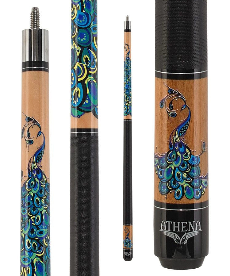 This Athena ATH47 pool cue features a forearm and butt sleeve both showcasing the multi-colored peacock. With the black Irish linen wrap, 12.5mm layered Boarskin tip and free 10" extension you will definitely want to try out this cue.