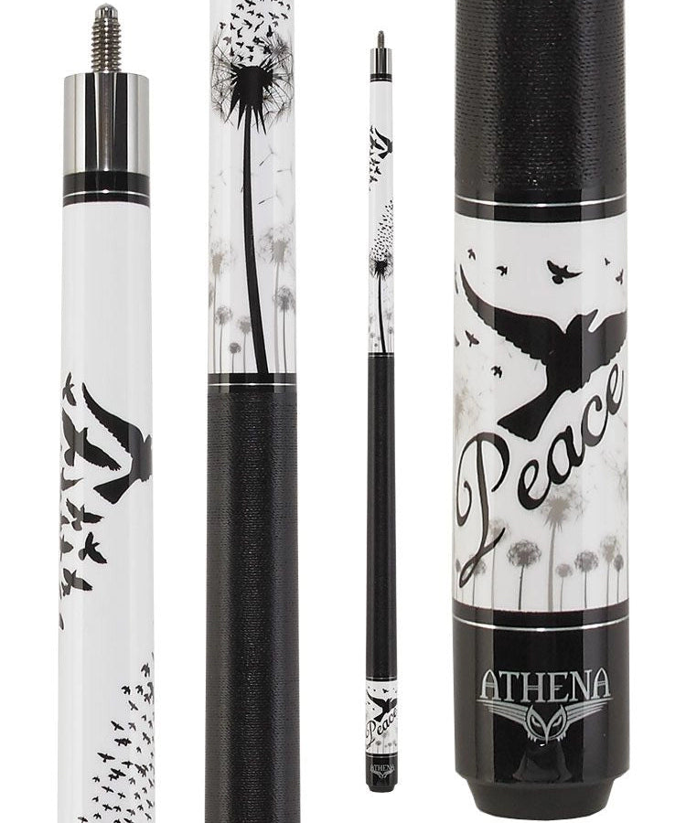 The ATH48 pool cue is a 57" cue, an inch shorter than most cues. It has a white with black dandelion and bird Peace design, and comes with a black linen wrap and a 10" free extension.