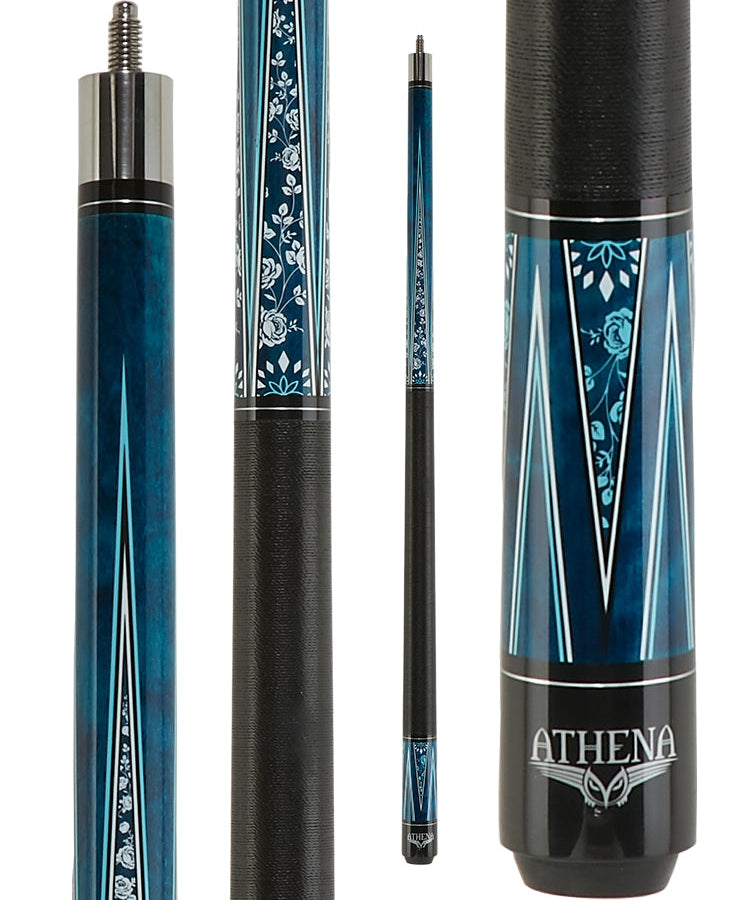 This Athena ATH49 has a distinctive look with its teal, black and white points on a blue-stained maple butt all of which are encasing white roses with a Black linen wrap. It’s a 57" cue stick, an inch shorter than most cues.