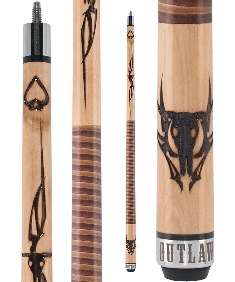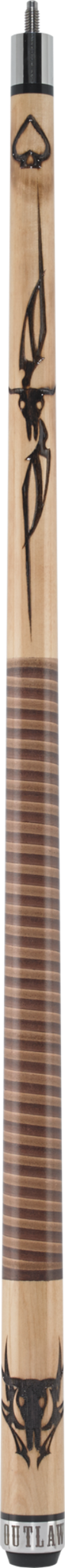 Rekindle the rowdy pioneer spirit of the Wild West with this new Outlaw cue! This new cue is engraved on both the forearm and the sleeve with crisp cattle skull designs backed with striking tribal patterns. As with all of the Outlaw cues, this one also has a leather wrap; the wrap on this particular cue is unstained and comes with a natural, light brown coloration, giving it that distinct old-school feel.