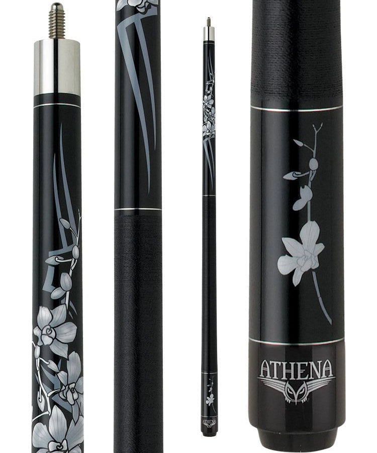 The Athena ATH32 Pool Cue combines the best there is in cue-building process: Stainless steel joints, even 10” cue extenders for hard-to-reach shots. It features a Black stained hard rock Maple with Tribal and Orchid flower design and a black ring with thin silver ring inside. It is made for women by women, has a black-stained Maple stunner with tribal and orchid designs.