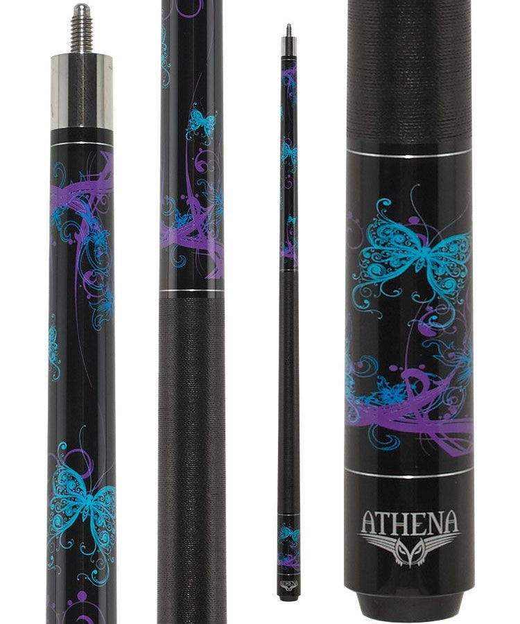This Athena ATH44 cue stick has teal and purple butterflies on a black background with a black Irish linen wrap. The butt plate features the teal and purple butterflies above the silver Athena Logo.