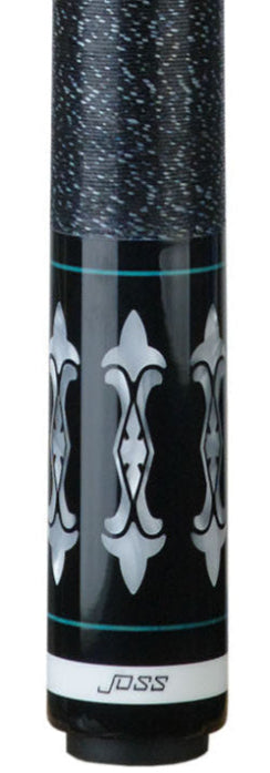 The Joss 10-20 stands out with a Curly Maple forearm featuring six Ebony points, each encased by black, green, natural, and teal veneers. A mother-of-pearl diamond inlay is placed inside each point, enhancing the cue’s striking appearance. The Ebony butt sleeve features multiple large intricate pearl inlays, encased by green rings, adding a refined elegance to the design. The cue is completed with a black and white speck Irish linen wrap for a classic and secure grip.