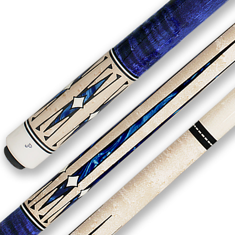 The Pechauer JP20-T cue delivers bold style and advanced playability in a handcrafted design. With a no-stain figured maple forearm and simulated ebony-framed Blue Pearl and simulated ivory inlays, this cue is a work of art. The blue-stained figured maple wrap adds a sleek finish while offering a secure, comfortable grip.