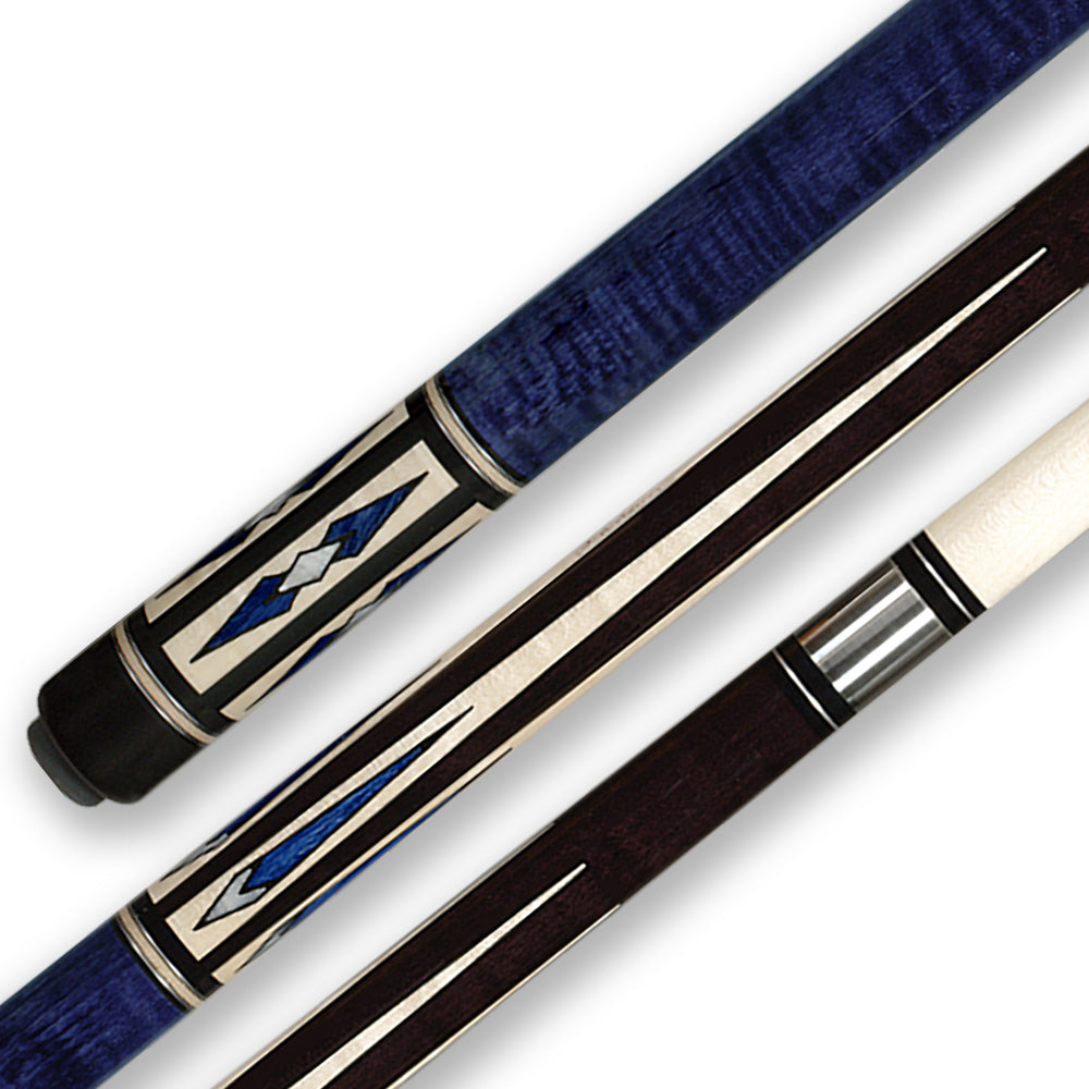Introducing the Pechauer P10-N, a masterpiece of elegance and precision. This cue boasts an ebony-stained Maple construction, complemented by a blue-stained figured Maple wrap for a striking contrast. Its design features no-stain Maple points, beautifully framed by simulated Ebony, and adorned with Blue Juma gem and Pearl inlays, creating a visual symphony. The P10-N is not just a pool cue; it's a testament to sophisticated craftsmanship and style.