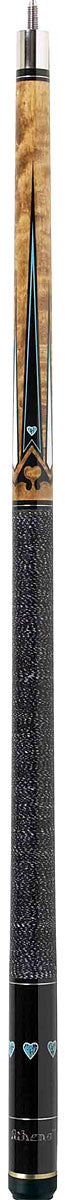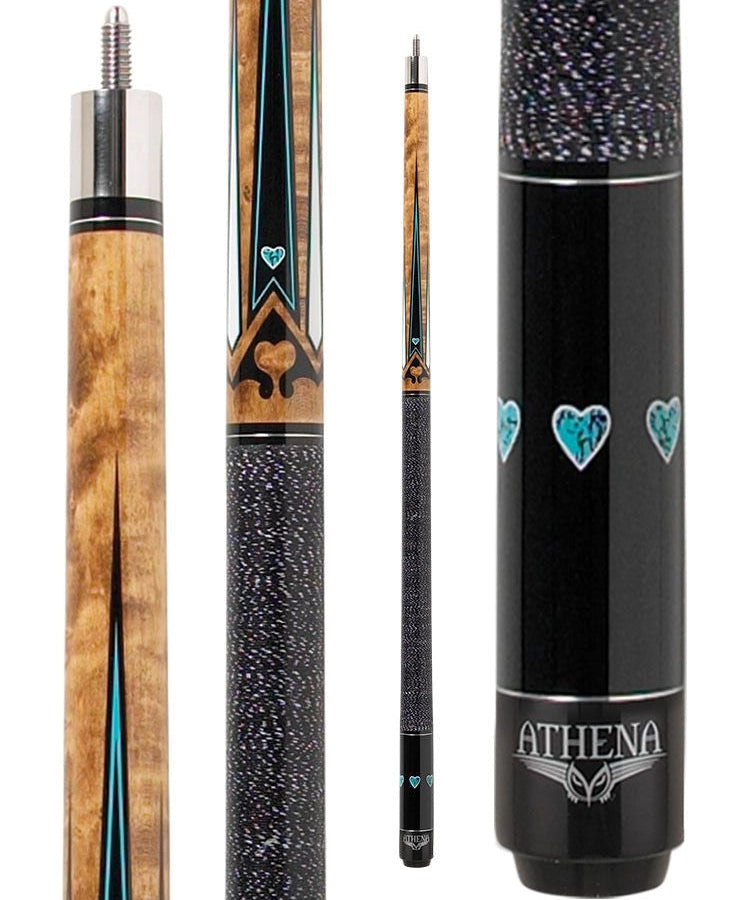 Athena ATH04 - 57” Pool Cue has a Natural stained maple forearm features black, white and turquoise point overlays and turquoise hearts on the black points and on the forearm with thin silver rings and a black Irish linen wrap with white specks. Perfectly designed for women and uses its shorter length for a more normal balance point.