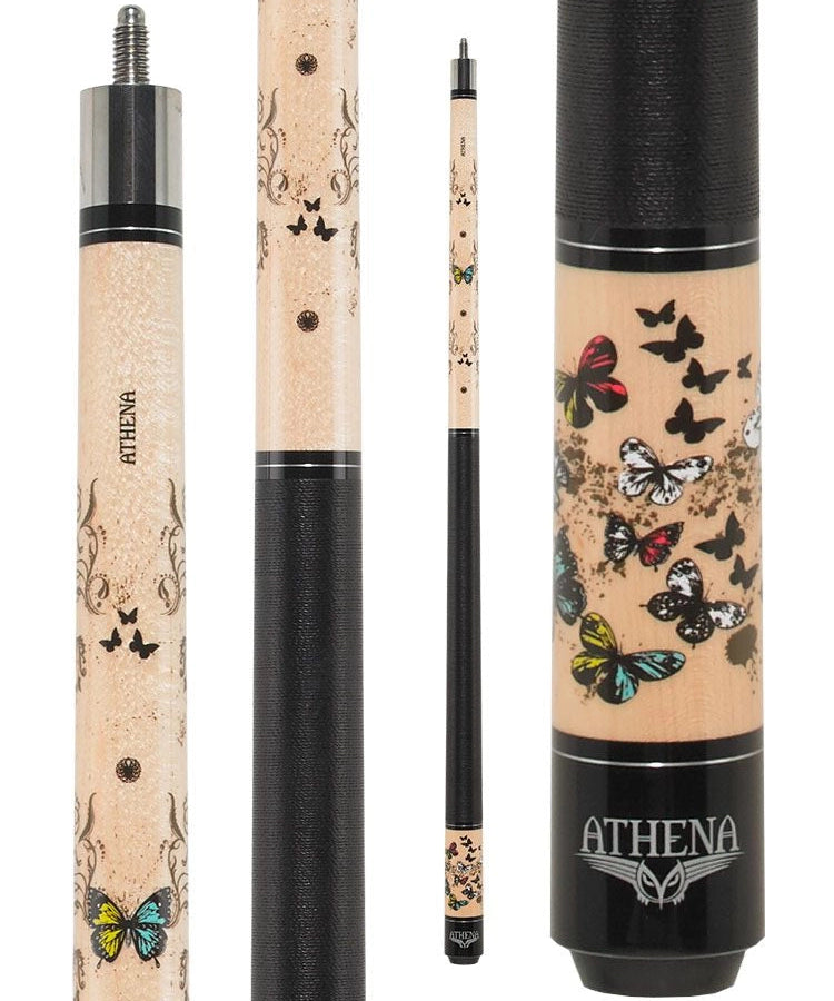 The Athena ATH45 cue stick is different than any of the other Athena designs, its maple forearm has multi-colored butterflies with black Irish linen wrap. All of that sits just above the Athena logo in sharp silver.